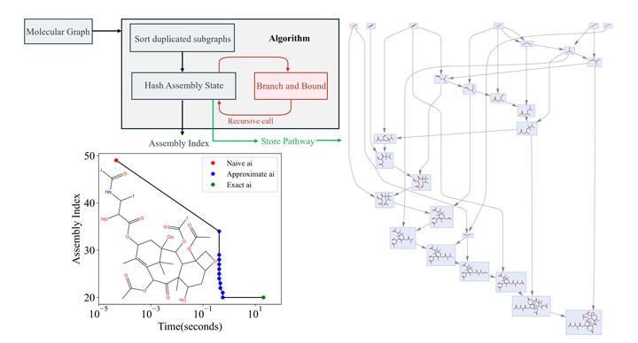 Journal Paper Figure 4,5: Algorithm pipeline and outputQuantifying how hard it is to build a molecular graph matters for biosignature detection, chemical complexity, and cheminformatics. We present an exact, scalable algorithm to compute the molecular assembly index (MA), which prioritizes the largest duplicate subgraphs, represents fragmentation with an array of edge-lists, and prunes the search with both dynamic programming via a hash table of assembly states and a branch-and-bound heuristic guided by a conditional addition-chain lower bound. For organic molecules in the greater-than-500 Da range, our approach is up to 6 orders of magnitude faster than prior methods and yields exact MAs where previous algorithms would have timed out. We compute MAs to convergence for ∼300k COCONUT natural products with <50 bonds, profiling time and memory scaling. Finally, we exploit the speed of our algorithm to calculate joint assembly spaces and introduce the Joint Assembly Overlap (JAO), a Jaccard-like metric that emphasizes global scaffold reuse, and show that the JAO yields substantially different rankings from Tanimoto similarity with ECFP fingerprints and MCS (e.g., in steroids 270–380 Da and short peptides), accounting for substructural similarity beyond local environments. Together, these advances turn the molecular assembly index into a practical tool for large-scale exploration of chemical space.